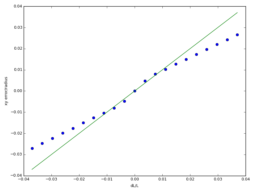 That all said, we can still try and accommodate the necessary adjustments in leveling and look at the final relationship between arm length and print size accuracy. In the following plot, I considered just points within 20 mm of center. I sampled arm length deviatons from -10 mm to 10 mm. For each case, I adjust the printer radius until the z error is less than 5 microns. Then, I find the average ratio of the cartesian error and radius from center. For small objects, this tends to be fairly consistent. I eventually end up with: