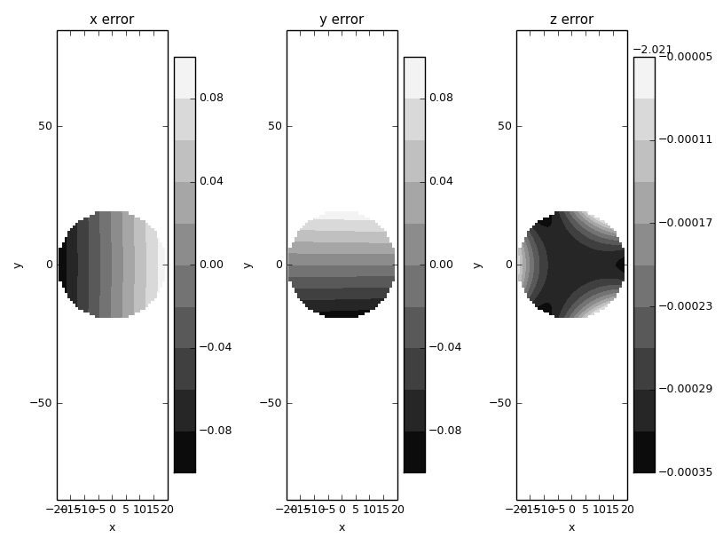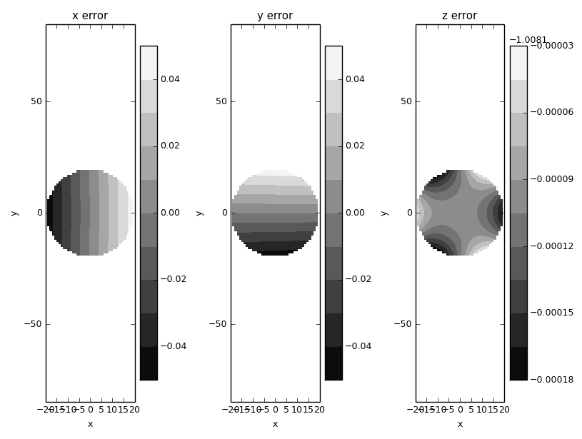 Here, I increased the arm length by 1 mm, and for a specified cylinder of diameter 40 mm, we'd expect the output to actually have diameter around 40.16 mm. However, if you look at the z error introduced by our arm length modifications, we see that we now have a concavity problem. It shows that there's only a 5 micron error, but keep in mind that this is for a 40 mm diameter region. If you were to re-run this for the entire build plate (radius 120 mm), you'd see a z error of 180 microns. Of course, we can accommodate this: