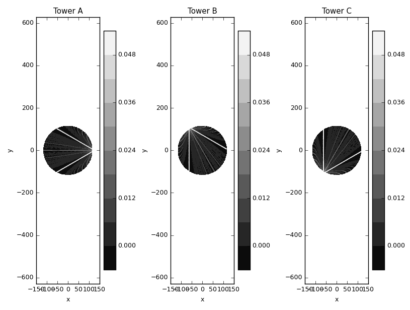 In my initial cursory overview of delta kinematics, I looked at the effects of tower movement error. This is effectively the same as poor leveling with an incorrectly-set endstop or tower height. I introduced a range of errors between -1.0 and 1.0 to each of the towers and found the regions of the workspace where the resulting z error was less than a micron difference from that tower's effective error. Most instructions suggest measuring the region directly in front of towers to set the endstop for that tower, so I wanted to see if that was indeed the optimal point to test: