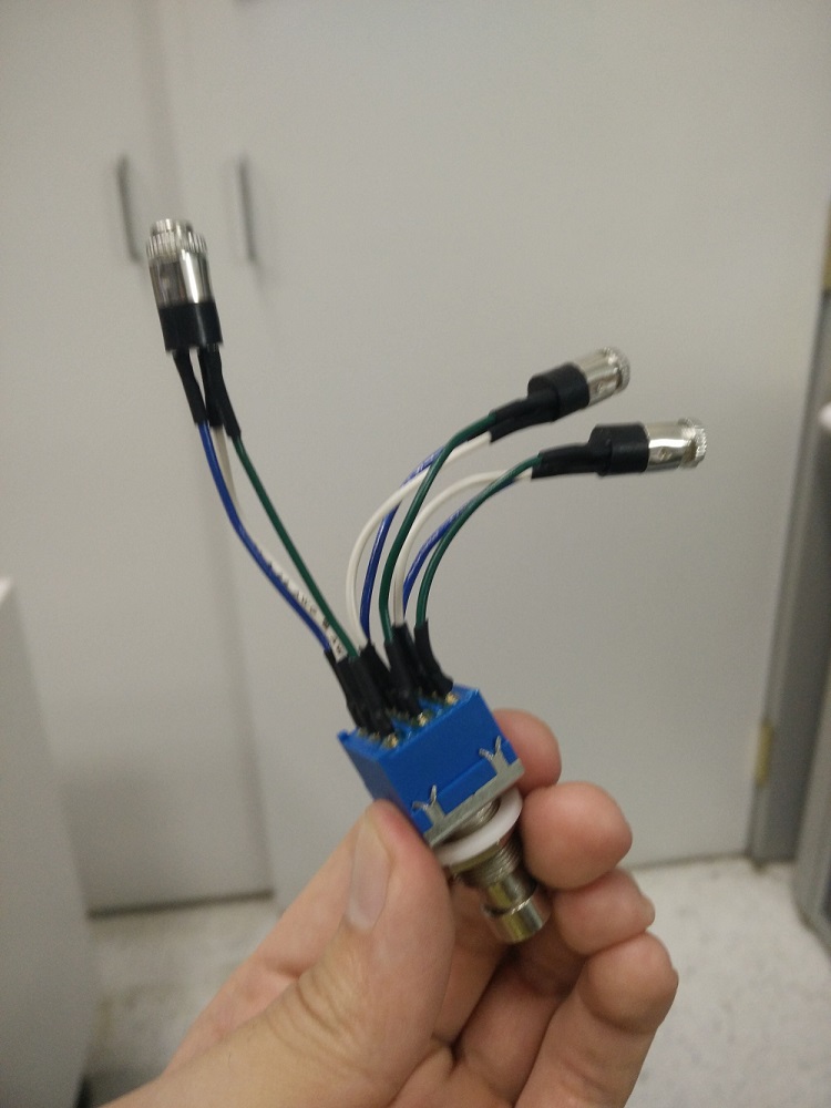 Pretty straightforward. The headphones hang on the hook, and when enough weight/force is applied, the switch gets toggled, and we connect the source to either the headphone or speakers jack. Now, I did make a pretty major mistake here. I had hoped to get a 3PDT button, not a toggle, so that I could calibrate everything such that the weight of the headphones would switch the output. With a toggle, that's definitely not the case. In fact, if the headphone's too heavy (or if the hook offset is too large), you have to physically lift the headphones to reset the switch after toggling, which could be a little annoying.