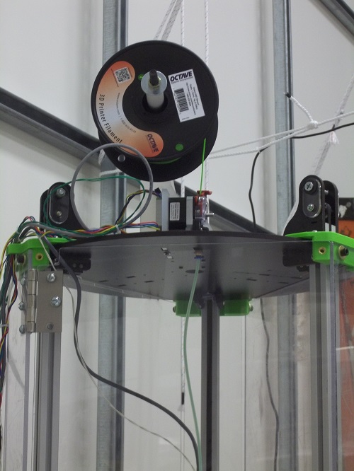 Since the Rostock MAX includes a heated bed, I mainly wanted the enclosure to just eliminate the effects of drafts, and I still wanted full visibility of the print, so I only used 1/4 and 1/8 inch polycarbonate sheets. Instead of enclosing the entire printer, I added attachment pieces to the three main posts and only enclosed the build area. I also moved the extruder stepper motor to the outside of the printer, so that none of the steppers are in the heated environment. I had found some conservative estimates suggesting that it would be dangerous to run steppers in environments with ambient temperature above 50C.