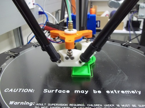 I'll write about this in much further detail in the future, as my current setup is just the first step towards an automatic, magnetic tool-changer, similar to what was done here in late 2012 and proposed for the Zego Delta Printer. The big limitation I see in 3D printers is the limited number of extruders. Most FDM printers have at most two extruders, with one dedicated to support material. The Kraken from e3d is a four-nozzle solution for hobbyists, but it runs into the issue of leveling and nozzle leakage. If you look at the higher-end, desktop Stratasys printers, the nozzles ride on a pivot to ensure that the unused nozzles are shifted out of the way to avoid collisions. Solutions like the Kraken are also limited to standard filament materials and cannot extrude materials like fluid resins or conductive inks.