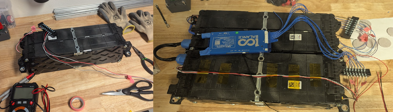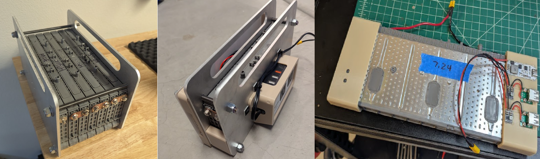 My last startup gig focused on the autonomous dismantling and testing of EOL electric vehicle batteries for potential re-use as second-life storage batteries. The idea was that batteries from old electric vehicles unsuitable for the road are probably still quite good for storage applications, so there should be a business case for repurposing those batteries instead of just disposing them or going through the costly process of recycling them. It wasn't a crazy revolutionary idea: Posh Robotics (now Posh Energy) was a YC startup that pitched that idea a year or so before us, Redwood Materials demonstrated a second-life BESS at their recycling plant many years ago, BigBattery in nearby Chatsworth had been running a seemingly profitable business on this concept for years, and B2U had been (and maybe still are) shoving old Nissan Leaf packs into storage containers for grid storage. Unfortunately, the startup died before we could get to building second-life batteries from salvaged cells (we had focused on autonomous dismantling and testing), but as part of our liquidation process, I ended up with a bunch of sketchy EV battery modules and cells in my house, so I (very slowly) built some off-grid power banks out of them.