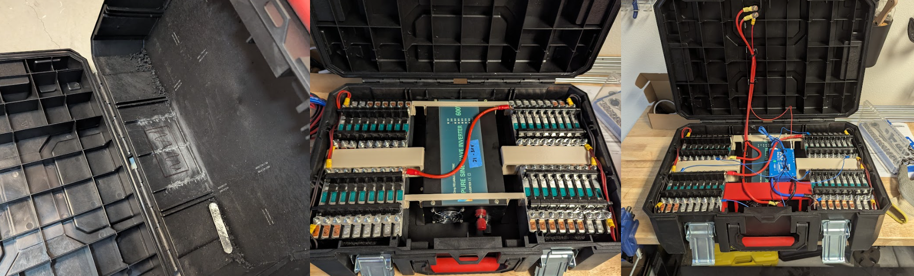I lucked out again with this Bauer container box from Harbor Freight when I tried building a bigger version of the previous pack. The RAV4 cells also fit really nicely inside, and I was able to pack in a 6S6P (36 total cells, 22.2V nominal) configuration with a 600W inverter. Similar to the last build, I sized some 3d-printed adapters and spacers to keep everything as tightly constrained against the sides of the box as I could. I also tried to be less ass at wiring and tried to route the cabling around the hinge so that you can actually open the box all the way without disconnecting anything if you needed to do maintenance.