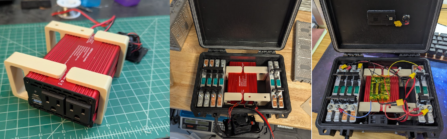 For this power bank, I shoved a 3S2P configuration into a gun case from Harbor Freight, along with a 400W inverter. Unlike the NiMH case, 3S lithium-ion configurations pair pretty well with 12V subsystems without inadvertently triggering any low/high-voltage alarms. The case was sized very conveniently for the RAV4 cells, allowing me to reuse the standard plastic separators from the original module, which then meant I could re-use the busbars as well. I used a dremel to create access ports for both the inverter and the voltage indicator. The extra printed bracket around the inverter was meant to fill the remaining gap and keep some compressive force on the cells to prevent swelling. There just wasn't enough space for a 3S3P configuration, but this little cases provides about 150 Wh.