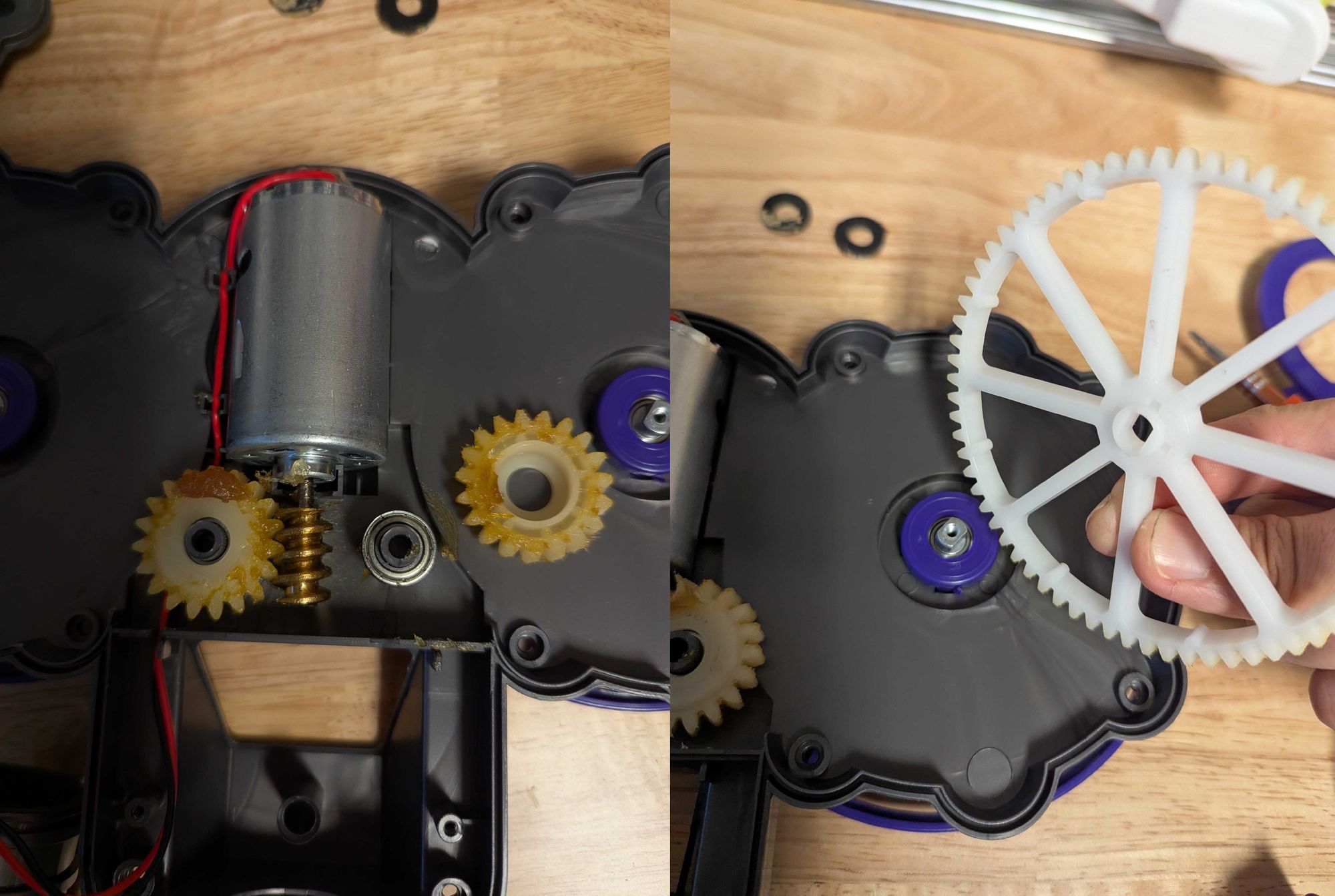 The transmission isn't anything too crazy: single DC motor with worm gear driving a pair of angled spur gears that then drive larger spur gears coupled to the spinning mop cover plates. The mop pads themselves affix to the bottom via velcro. I couldn't see anything clocking or restraining the motor aside from frictional force from the top-half of the clamshell, but with the degree of gear reduction and the non-backdriveability of the thing, I guess the motor isn't ever at risk of getting dislodged due to torque issues from jamming.