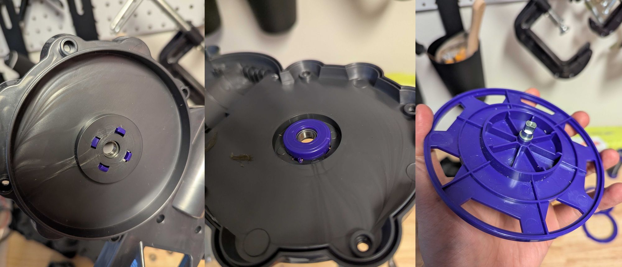 The shaft for the mop pad plates seem to be either overmolded or glued to the plastic plate body. I wonder if that's to accommodate the basic 608 bearings used everywhere else. Intuitively, why wouldn't a larger bearing and then a plastic post have sufficed here?