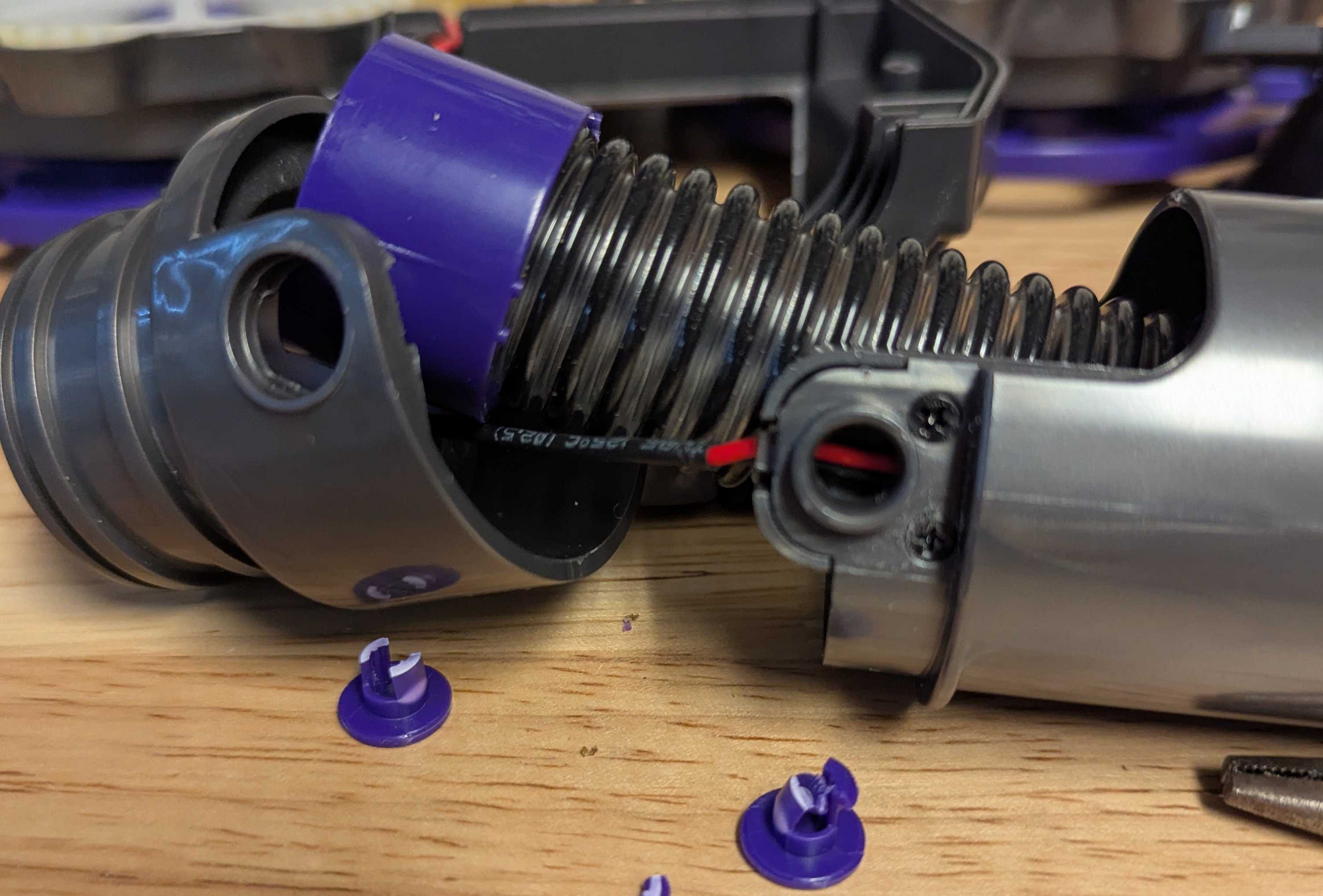 The main pivot or swivel joint around the hose uses snap-fit plugs. The hose prevents any sort of rotary shaft that runs through the middle, and I guess two snap-fit pieces are significantly easier to install than anything w/ fasteners. I'm surprised this joint can hold up to use and abuse without bearings or bushings or at least something stronger than plastic, but maybe I shouldn't be, since the rotary range of motion should be fairly minimal, and you wouldn't expect any crazy side loads. The plugs were not great for disassembly, as the tabs were super-fragile and easily broke off as I tried to depress them w/ pliers while yanking them out.